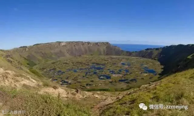 拉诺卡乌火山湖(Rano Kau)像一口巨型池塘,火山口里面独特的气候形成了这片被芦苇覆盖的湖泊,从南面崩塌的缺口望出去是一抹纯净蔚蓝的大海,很漂亮的地方。