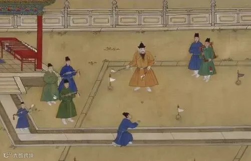 明宣宗行乐图图中拿根小棍瞄准地上一枚弹子者为明宣宗。你猜他在干啥?打高尔夫。真的,这项运动古代叫捶丸,拿小棍捶石球之意也。最早起源于宋代,元代时期大受上流社会欢迎,在明代成为流行运动。是一种无论男女,老少咸宜的休闲娱乐方式。