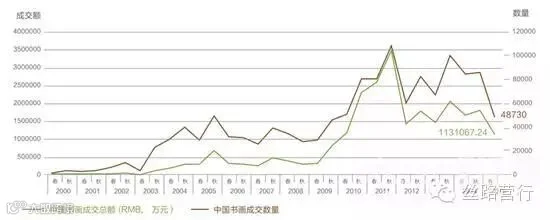 2000-2015年中国书画成交数量与成交额走势图