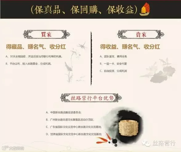 丝路营行创新性地提出了藏品的保真、交易担保服务,并承诺30天内无损伤退回,经专家审核无误后,返还月利息(按银行当期存款利率)为买卖双方建立安全保障。