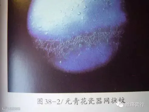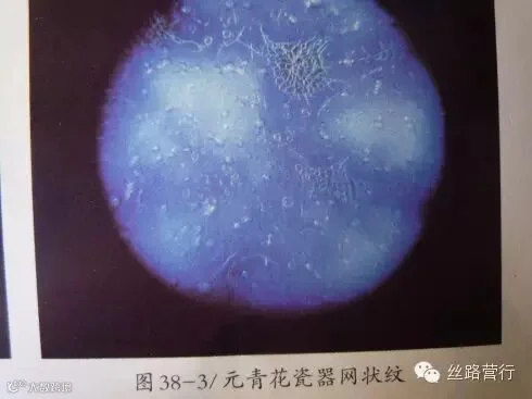 元青花独具特征,不同于以后的洪武,永乐,宣德时期的青花。如果用40倍的放大镜照视的话,就可以看到深色结晶斑的表面所形成的一种网状特征(图38).