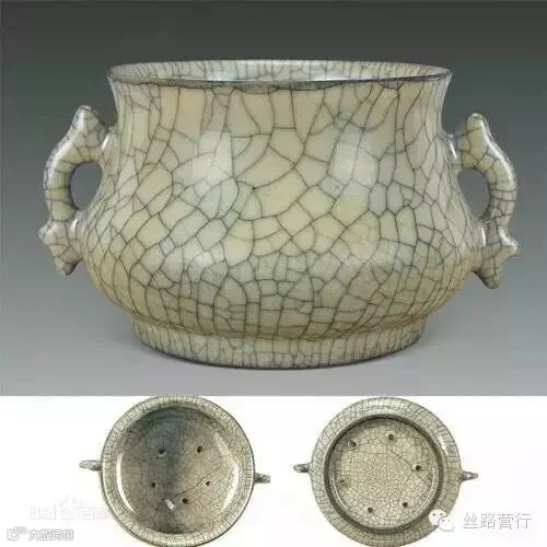 从传世至今被定名为哥窑的瓷器来看,其主要特点是胎色较深,在器物口沿和足部釉料较薄处,会呈现出“紫口铁足”的特点。釉色通常较暗,呈青灰色,通体带有开片。开片就是我们见到瓷器上带有装饰性的裂纹,起初是由于烧造时釉料的膨胀系数不均造成的,后来被工匠巧妙地利用而产生的一种特殊纹饰。由于此类瓷器胎色与釉色的特殊搭配,在开片处展现出“金丝铁线”的效果。