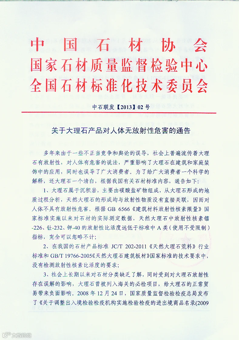 中国石材协会在北京举行“《中国天然大理石白皮书(2013)》新闻发布会”,并向社会宣告称,天然大理石对人体健康无任何危害,可以安全使用。