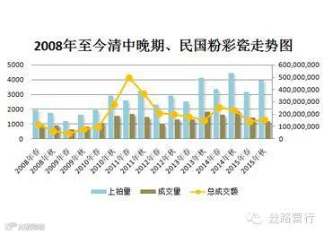 据雅昌艺术市场监测中心的不完全统计,2008年至今,清中晚期、民国粉彩瓷器共计上拍43933件,成交20515件,斩获30.2亿元的成交额;虽然拍品品质参差不齐会导致成交率下降,但这部分瓷器成交率保持在45%—65%之间。