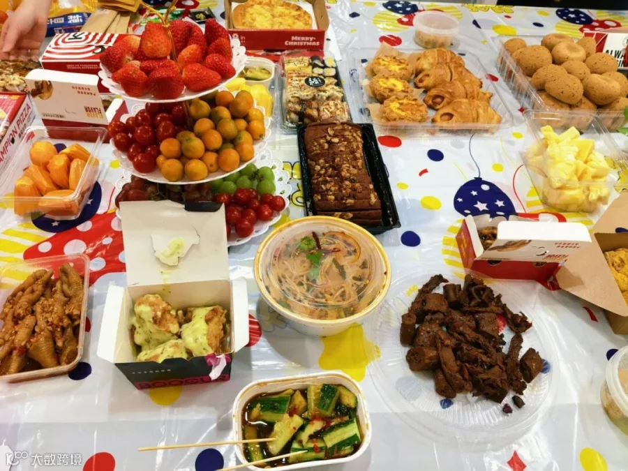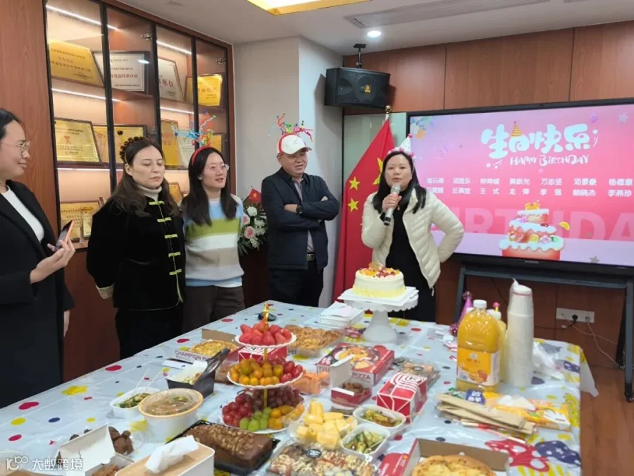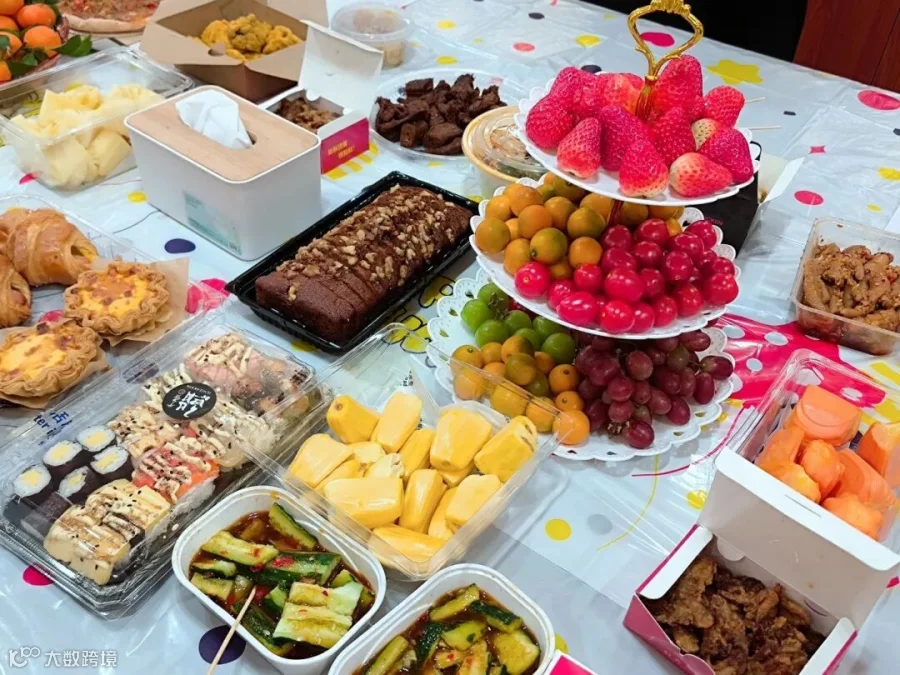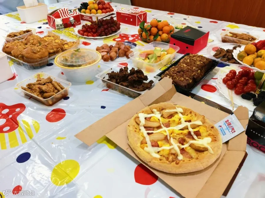 最后,生日会进入了惬意的美食分享时刻。大家围站在一起,尽情享用行政部精心准备的各色美味。香甜的蛋糕,清爽的饮料,搭配披萨、凉拌菜、烤鸡翅、寿司等多样美味。大家吃得开心,并给行政部的小伙伴们点个赞!