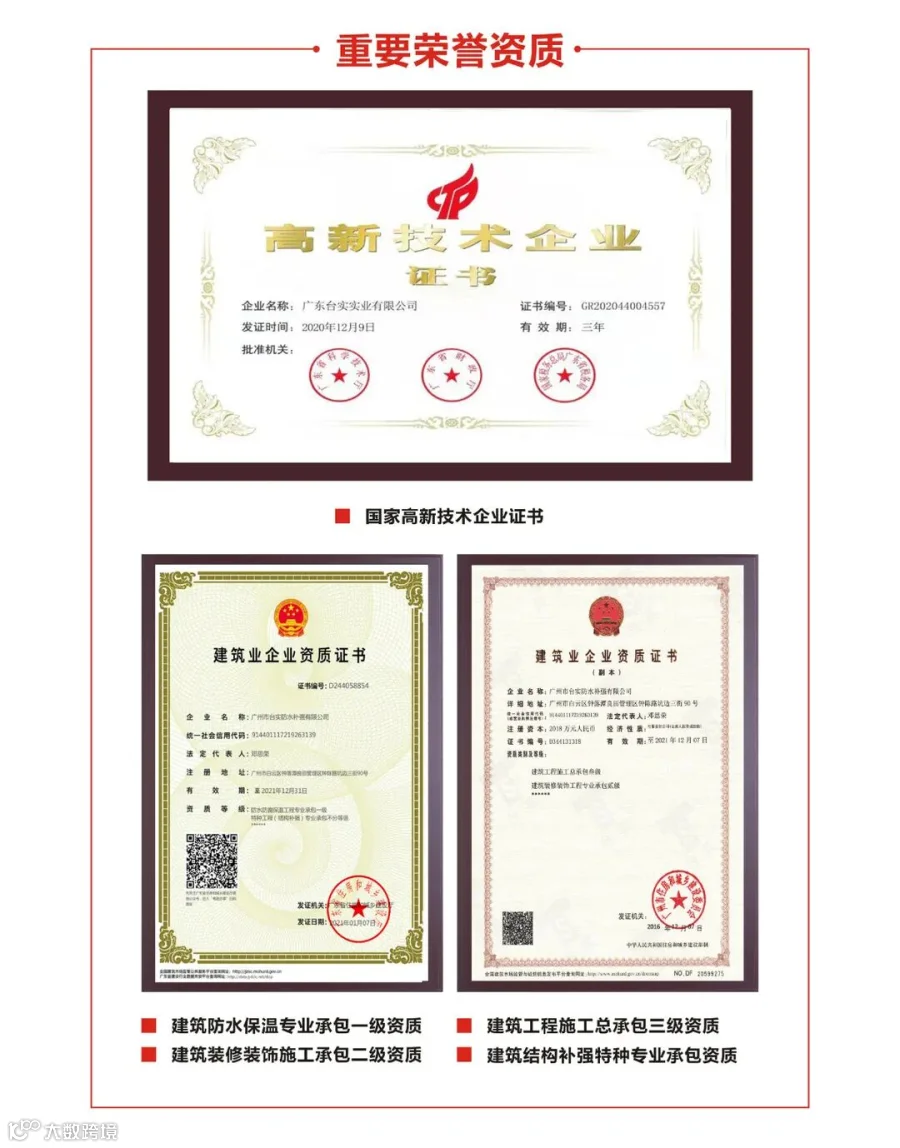 在三十余年的行业深耕历程中,台实积累了大量丰富的工程实践经验和成功案例,能针对建筑防水、建筑修缮领域上出现的各种难题,向客户提供成熟可靠的解决方案。如:港珠澳大桥海底沉箱裂缝治理、珠海横琴管廊隧道透水治理、广州流花湖湖底排污管透水治理、广州白云国际机场渗漏治理等均彰显了台实的技术实力。作为建筑系统诊治专家,市政修缮领军品牌,未来,台实将始终秉承“与建筑相融共生、与环境和谐共生、与人互利共生”的企业宗旨,以“让建筑健康长寿”为企业使命,为城市保驾护航。