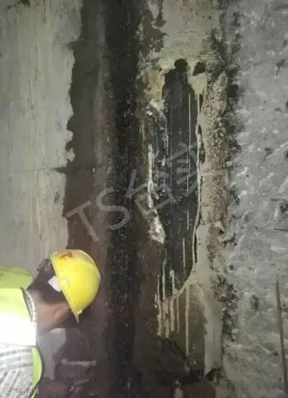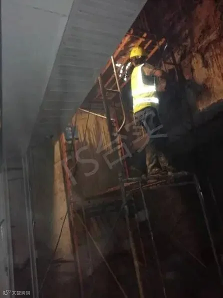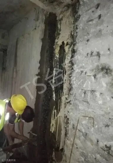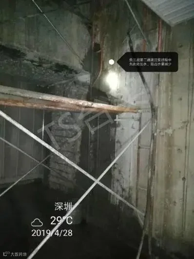 为了有效治理该项目严重的渗漏问题,台实根据丰富的实战经验,克服重重困难,对侧墙壁后采取了化学灌浆加固抗渗处理方案,充填结构间隙及提高软质土层结构强度。灌浆后持力层其力学强度、抗变形能力和均一性得到提高,整体结构得到加强;壁后淤泥或淤泥质土和粉、细砂通过钻孔灌入浓浆后,使土体压密和置换。间隙充填与壁后回填土形成密实的不再渗透水的复合固结体,相互共同作用起到堵漏、提高承载力的作用,侧墙整体得到防水帷幕包裹的效果,从而达到控制结构抗渗的目的。
