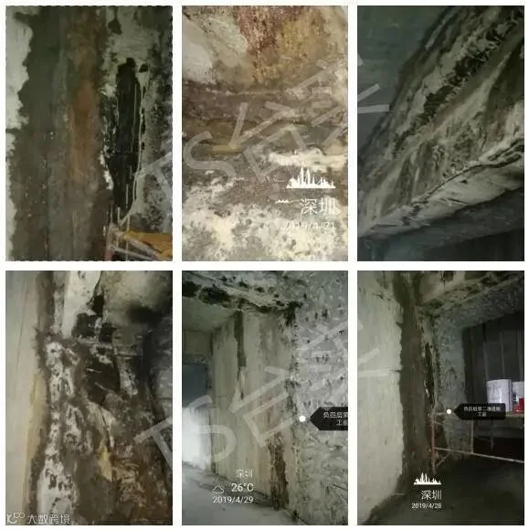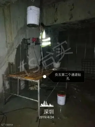 平安金融中心地下共5层,地下一层层高6.85米,地下二层层高6.4米,地下三层层高3.8米,地下四层层高6.2米,地下五层层高4.6米。需堵漏加固部位位于南北塔-2,-3,-4,-5四层共七个连接通道,其中地下三层渗漏最为严重。地下连接通道区域的侧墙为800mm厚钢筋混凝土结构,侧墙壁后填充为粉质粘土层,结构主体已完工多年,连接通道侧墙可见经多次维修的痕迹,特别可见发泡聚氨酯类灌浆止水留下的补漏痕迹,这种材料对结构破坏较大,且难于保持对渗漏水部位的长期封堵,在工程上只作一些临时性的封堵处理,不能用作在堵漏水处理上,特别是在国家重点工程项目早就明令禁止使用范围,因此类材料会对后来的维护带来很大的代价,只是暂时性的止水,无法解决根本问题。另外该项目地下结构设计也非常复杂,渗漏位置处于南塔与北塔沉降缝,南北塔楼层高差异大,沉降不均发生概率也大,给渗漏修缮带来了一定的难度。