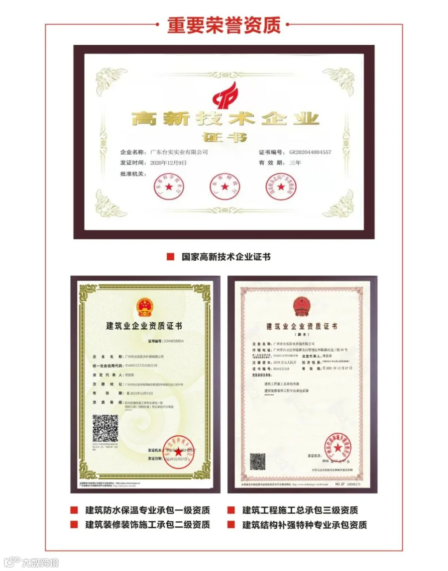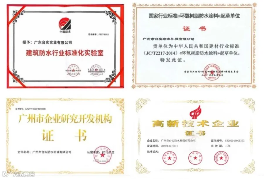 台实是一家集材料研发、制造、销售、施工、服务为一体的高新技术企业,在建筑防水、修缮行业耕耘三十余年, 在广州、韶关建立了两大产基地,品牌发展以来建立了高标准研发中心和实验室,引进了先进的研发实验设备,聚集了大批资深的研发技术专家,并与各高等院校、科研机构广泛合作,力求更好地完善公司的产品体系和工艺标准,以精益求精的态度研发出更多优质环保的建筑防水和建筑修缮产品。