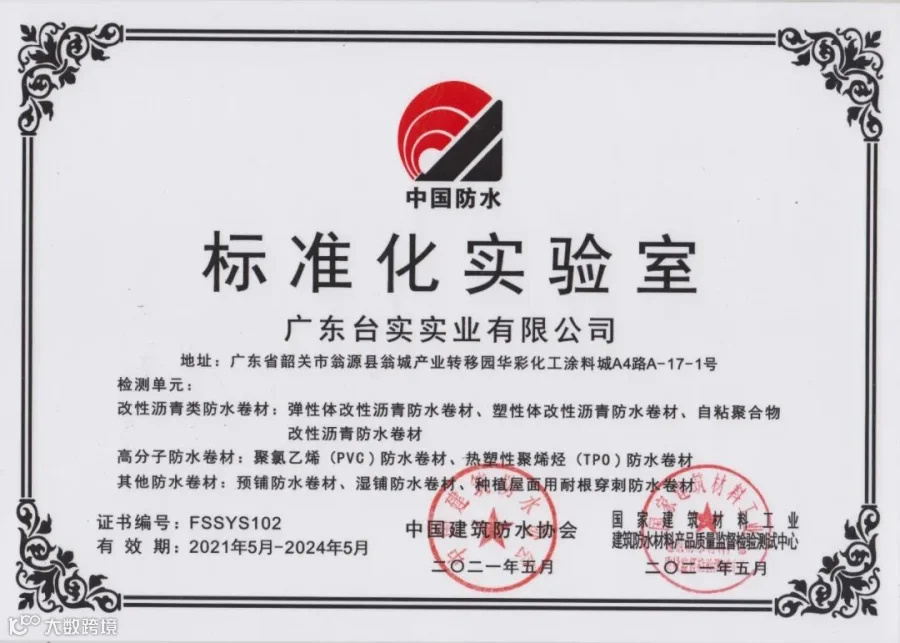 据悉,标准化实验室的评定标准严格,要求企业具有健全的质量管理体系、质量管理制度、质量检验相关技术标准和技术指导文件,并具有通过上岗认证的专职质检人员和相应检验能力的设备及试验场所等。经过检测环境、设施设备、制度建设、人员素质、技术能力等方面的全面审核,专家组对公司的实验室建设给予了高度评价,一致认为广东台实实业有限公司的实验室设施符合中国建筑防水行业标准化实验室的要求,审核予以通过。