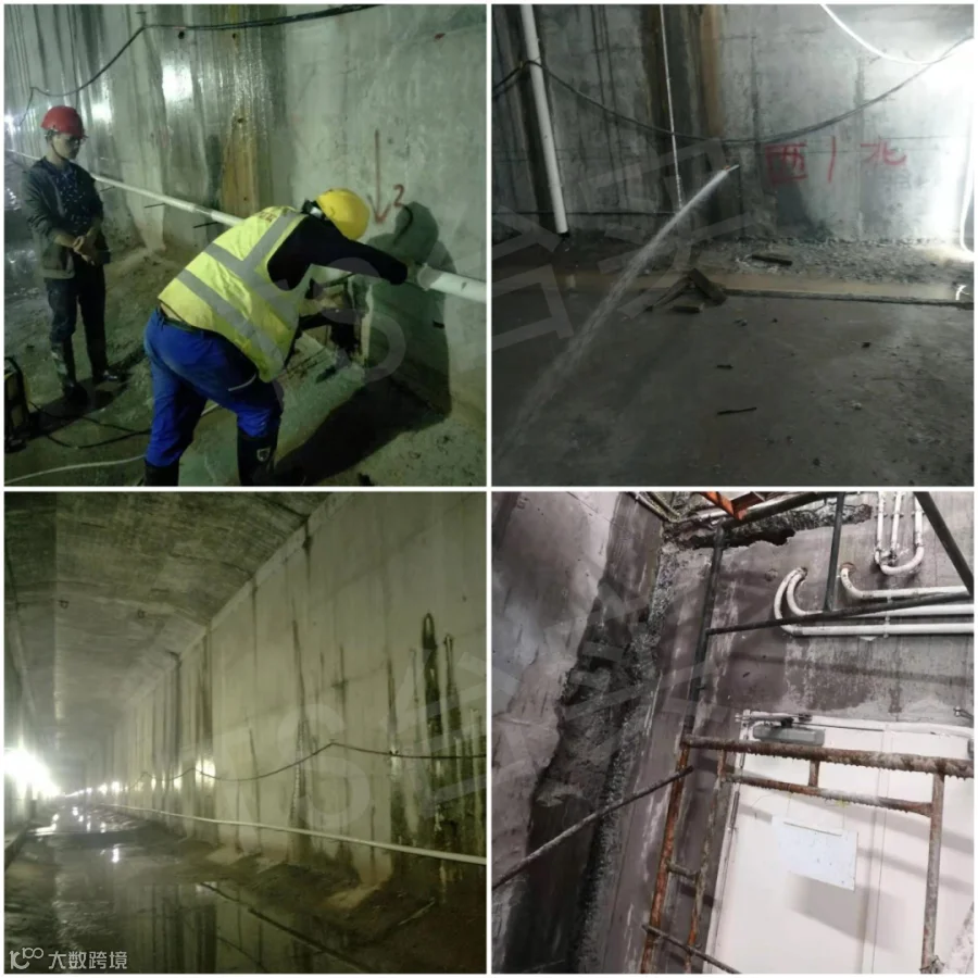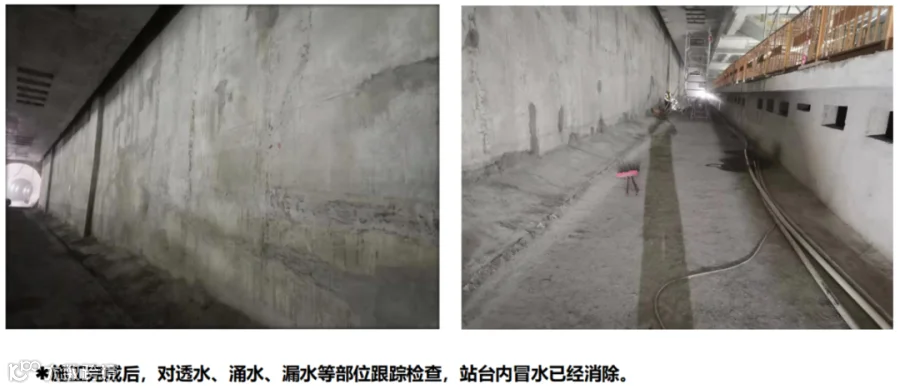 广州市轨道交通二十一号线工程【施工1标】土建工程位于广州市天河区员村二横路,沿员村二横路南北向布置,本标段工程造价为3.6亿元,车站为地下四层岛式站台车站,车站全长445.21m,标准段宽为23.8m,车站采用明挖法施工。此工程环境复杂,多条线路在此交汇,且位于珠江边,地下水量丰富,在主体完工后原防水层失效,出现构造薄弱部位大量渗漏水,对地铁运行带来巨大隐患,为了有效治理该项目临江站台,台实采用了专有的渗漏水技术治理和对站台混凝土结构进行抗渗处理,并用超细混干无机复配灌浆材料等化学灌浆方法进行大面积的壁后灌浆,在壁后形成包裹混凝土的不渗水防水帷幕。由于渗漏部位的结构层出现了裂缝及蜂窝,满足不了阻挡水流通过的要求,在地下水流的冲刷作用下,导致壁后地层与混凝土层间出现了液化及原防水层失效。台实通过壁后化学灌浆,让高强抗渗止水材料在混凝土结构壁后疏松间隙层充填、压密扩展形成抗渗的固结体,壁后混凝土层与粉质粘土层间隙、碎石垫层等充填固化成不渗透水的复合固结体帷幕,有效阻止水流通过。同时帷幕与板底、地梁、承台板、侧壁等部位粘结在一起形成复合防水整体,整体防水帷幕加强了防水的有效性,加强了承台、地梁及板的结构稳定,从而达到了控制结构渗漏水的目的。