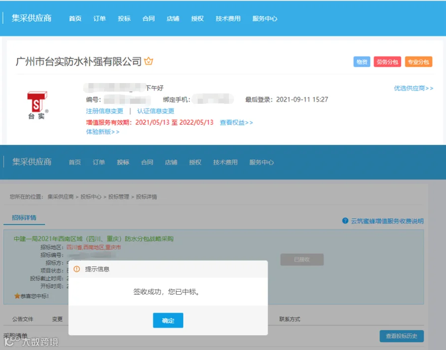 近日,中建一局2021年西南区域(四川重庆)防水分包战略采购项目入围结果公布,台实凭借优质的产品和精益求精服务成功中标!此次中标彰显了台实在建筑防水领域的核心竞争力,对公司拓宽市场具有重要的意义。