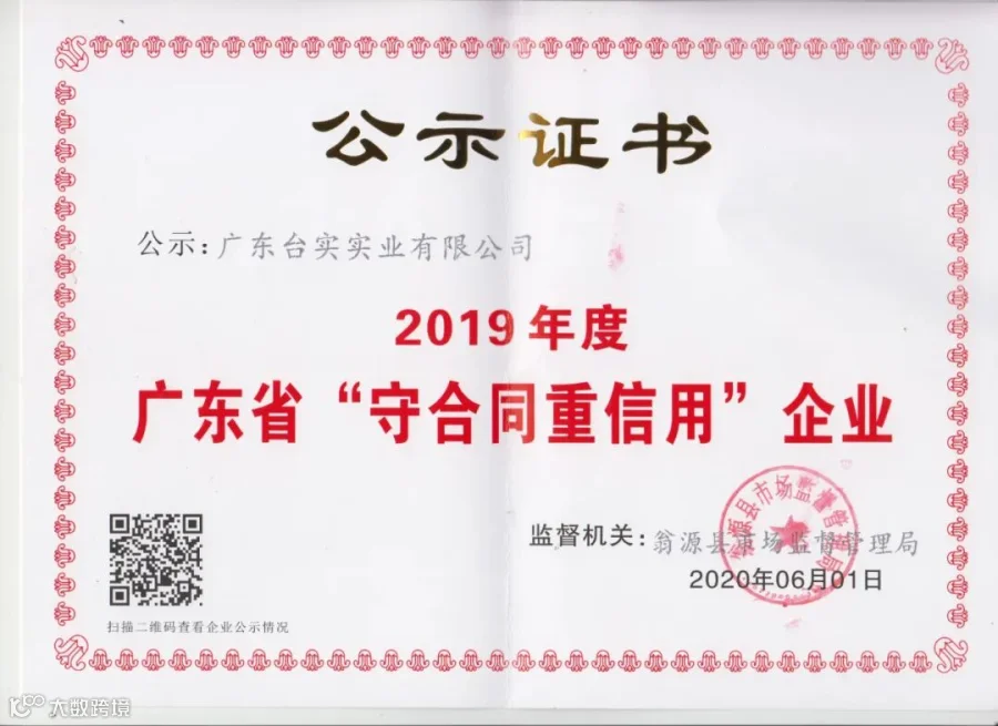近日,经翁源县市场监督管理局审核批准,广东台实实业有限公司获得2019年度广东省“守合同重信用”企业荣誉称号。