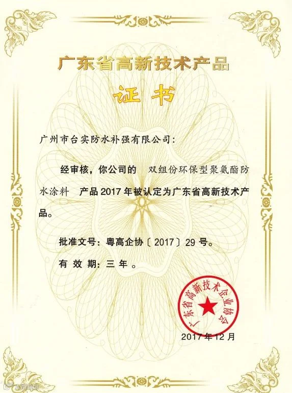 3月14日台实“双组份环保型聚氨酯防水涂料”和“单面反应粘高分子防水卷材”双双荣获的“广东省高新技术产品”证书下发到企业,这份殊荣是对台实产品的肯定,沉甸甸的值得台实人骄傲!