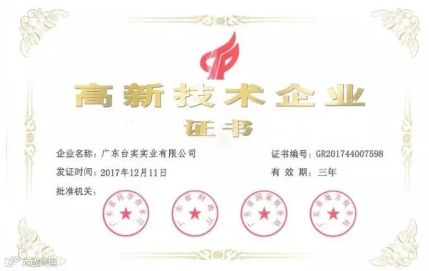 2018年5月10日,从广东省科技厅传来喜讯,广东台实实业有限公司获得四部委认证,荣获 国家“高新技术企业”荣誉称号,证书下发到企业。
