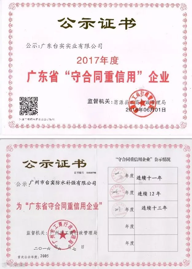 经过几个月的严格评审,台实防水最终通过广州工商行政管理局和翁源县工商行政管理局的审核,再次被评为“广东省守合同重信用企业”,这已经是台实防水连续十三年获得此项荣誉,也是对台实防水诚信经营、追求卓越品质和长期不懈努力的认可。