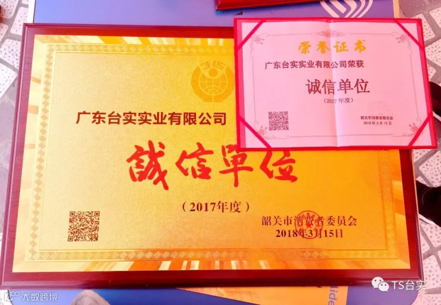 作为连续多年获得广州市颁发的“重合同守信用企业”称号的台实,应邀出席了此次活动,并荣获韶关市“2017年度诚信单位”证书和牌篇。这是韶关的消费者对台实的肯定,众望所归。