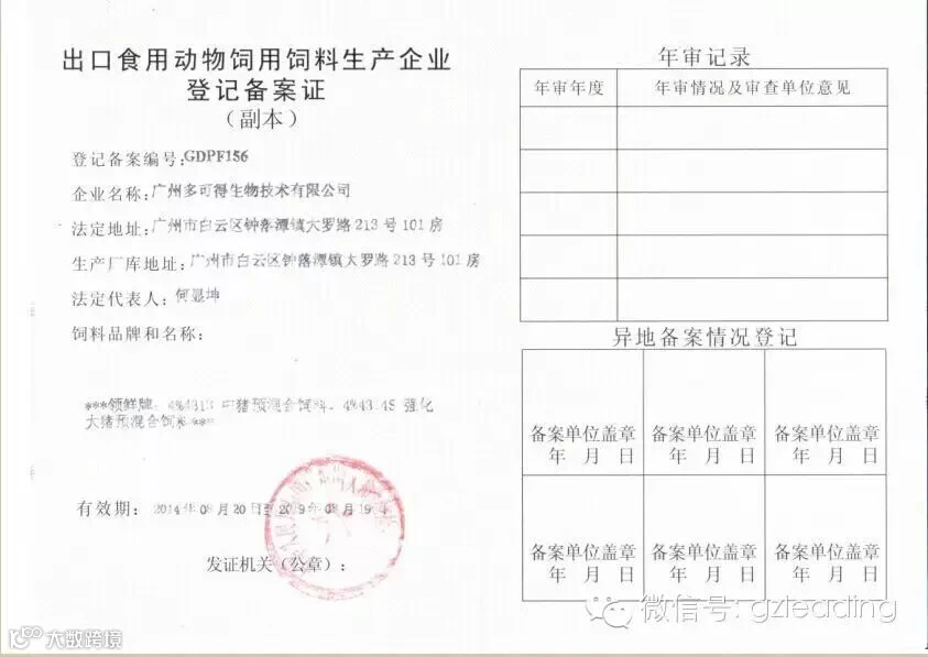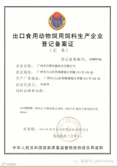 2014年08月20日广州多可得生物科技有限公司获得了广东出入境检验检疫局颁发的《出口食用动物饲用饲料生产企业登记备案证》。该证的取得是对我司产品的极大肯定,意味着领鲜品牌饲料可直销供港出口猪场,能帮助公司进一步开拓大客户市场。