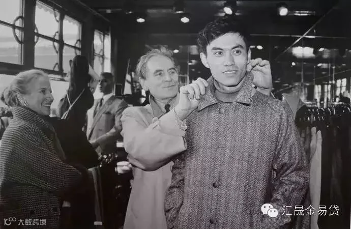 1981年,皮尔卡丹专营店在北京开幕,卡丹先生为男模调整衣领,使他显得更加英俊潇洒。