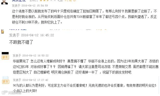 好吧,我们还是关心下华丽家族怎么回事。事实上,自从去年11月1日徐翔被扣之后,与他所持有的多家公司的股份被公安局陆续冻结。华丽家族就在11月10日公告,上海泽熙增煦投资中心(有限合伙)持有的华丽家族(证券代码600503)9000万股无限售流通股及孳息。冻结期限从2015年11月10日至2017年11月9日。