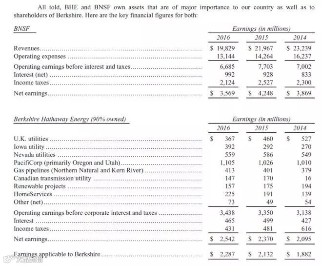 51、我们的BNSF铁路跟伯克希尔能源(BHE),我们90%控股的公用事业业务单元,拥有特别重要的特性,使得他们跟伯克希尔其他的业务有较大区别。所以,在这封信中,我们把他们单独列出来。去年,他们两家占了伯克希尔33%的税后营业利润。