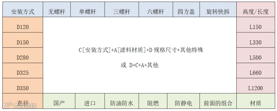 C[安装方式]+A[滤料材质]+D规格尺寸+其他特殊