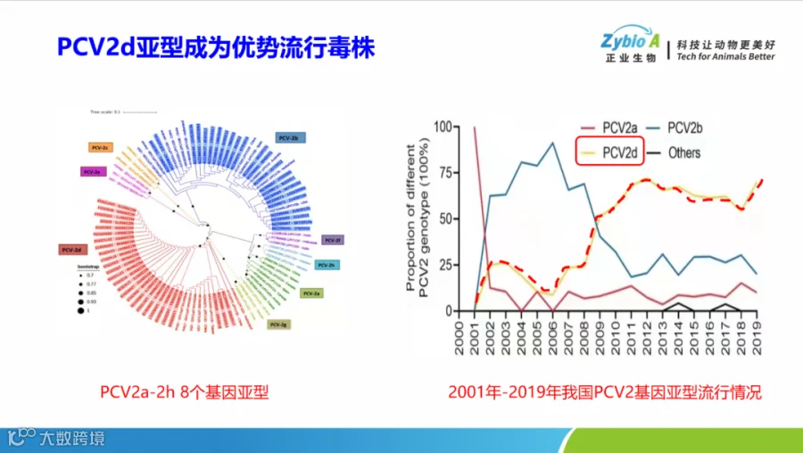7月19日,正业生物技术与市场部总监王红岩分享了题为《慢性消化道疾病对育肥成本的影响》的报告,他指出慢性消化道疾病因其症状隐蔽、病程长等特点,已成为影响养殖效益的重要隐患,尤其是猪支原体、猪圆环病毒感染对猪群生长性能及经济效益的重大影响。报告中用详实的数据分析了猪圆环病毒流行态势、监测数据以及防控案例。从近年来的检测数据可以看出,PCV2d亚型已成为绝对优势流行毒株,其致病性与传播力显著高于PCV2a、PCV2b亚型,与PRRS混合感染表现出更严重的临床症状、更低的平均日增重、更高水平的PCV2病毒血症以及更严重的淋巴病变等。