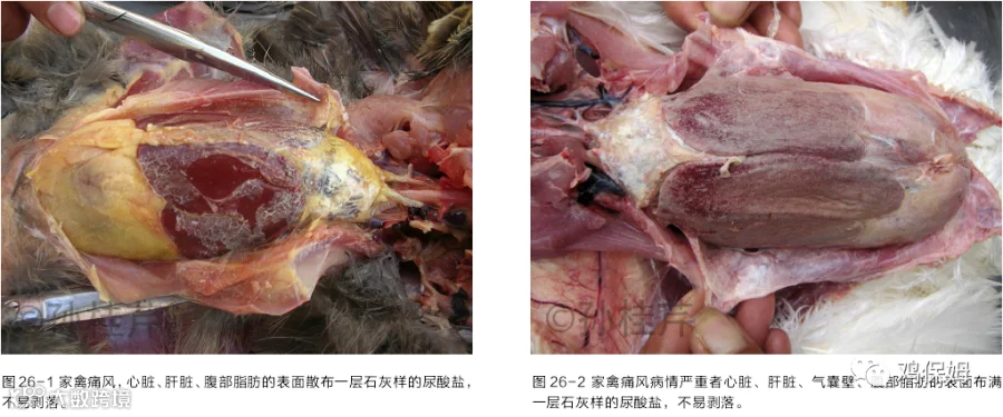 家禽痛风是一种与体内蛋白质、高钙代谢障碍以及肾功能障碍有关的高尿酸盐症。其特征是血液中尿酸水平增高,尿酸以钠盐的形式在关节囊、关节软骨、内脏的表面、肾小管及输尿管中沉积。一般多因饲料中动物蛋白质饲料或植物蛋白质饲料或钙添加量严重超标;或因 VA 长期缺乏;或因肾功能不全的因素如磺胺药中毒、霉玉米中毒、肾型传染性支气管炎、传染性法氏囊病等都可能继发或并发痛风。解剖可见内脏型痛风在胸、腹、气囊、肺、心包膜、肝、脾、肾、肠、及肠系膜的表面散布许多石灰样的白色尘屑样或絮状物质(图26),输尿管增粗,内充满多量白色的黏液,病情严重者含有不规则的结石,有时可见肾脏一侧高度肿胀而另一侧萎缩。