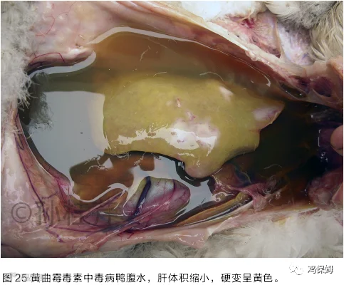 黄曲霉毒素中毒是人和畜禽共患的中毒病。是由黄曲霉菌和寄生曲霉菌产生的毒素引起的。这两种曲霉菌广泛存在自然界,常见在谷物粮食、玉米、花生、黄豆、大麦、小麦、饼粕、饲草等鸡、鸭饲料的原料中。这两种菌产生的毒素有10多种,其中B1毒素的毒力最强,并不易破坏,鸭尤为敏感。它主要损害家禽的肝、血管、中枢神经等。病程长时,可致肝癌。雏鸡黄曲霉毒素中毒后表现为病雏腹泻,粪便多混有血液,共济失调,呈现角弓反张症状死亡。成年鸡、鸭多为慢性中毒,表现为腹水,腹腔内充满了茶黄色的液体。肝体积缩小、硬变,呈深黄色,并有多量黄白色的坏死点(图25)。