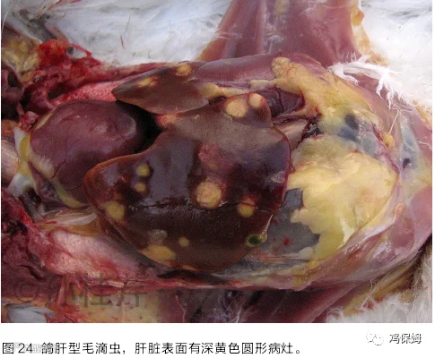 本病的病原是毛滴虫,主要是接触性传染。由于成年鸽是无症状的带虫者,常成为乳鸽的传染源。通过成年鸽给幼鸽哺乳而直接传染,6-15日龄的幼鸽感染后10d左右死亡。成年鸽在婚恋接吻时受到感染;健康的鸽也可通过饮食污染的饲料和饮水而感染。鸽的毛滴虫病根据感染的部位分为咽型、脐型和内脏型。内脏型毛滴虫病变在肝脏、脾脏的表面可见灰白色或深黄色界限分明的结节。在肝实质内有灰白色或深黄色的圆形或圆球型病灶(图24)。