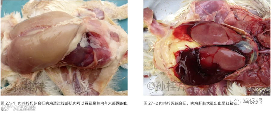本病以生长快速的肉鸡多发。一般认为是由于心脏、肝脏、肺脏等内脏器官生长发育慢,不适应肌肉和骨骼的快速生长发育的需要。公鸡发病多于母鸡、生长快速的鸡比生长慢的鸡发病率高。死前无明显症状,突然发病,失去平衡,仰卧或伏地,翅膀扑动,肌肉痉挛,发出“嘎嘎”声,有的尖叫,向前或向后打转,死后从口角流出大量食物,同时出现明显的仰卧姿势,两脚朝天,少数侧卧或伏卧,腿、颈伸展。解剖病死鸡为肌肉丰满、体格健壮的鸡,嗉囊和肌胃内充满刚采食饲料,嗉囊及肠道内充满血凝块,心房扩张瘀血,内有血凝块;心室紧缩呈长条状,质地坚实,内无血液。肺瘀血、水肿。肠系膜血管充血,静脉怒张。肝脏出血、色淡,肾脏苍白,有的出血血液呈红褐色(图27),而脂肪肝脏出血是黑红色血凝块,要注意鉴别诊断。
