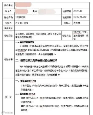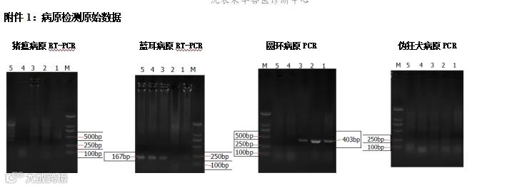 辽宁某猪场(200母猪),2019年以前生产很稳定,猪瘟、伪狂犬、圆环、蓝耳、口蹄疫等基础免疫正常,2019年2月份该场老板(非畜牧兽医专业人士)听从别人告诫:非瘟形势下,尽可能不做疫苗。从2月份开始猪场只做猪瘟,其它疫苗全停。从3月份开始,猪场陆续出现不稳定状况,尤其是8周-14周保育猪及育肥前期的猪只出现死亡状况严重,于19年4月23-26日分两次送检5头病猪,检测结果如下。