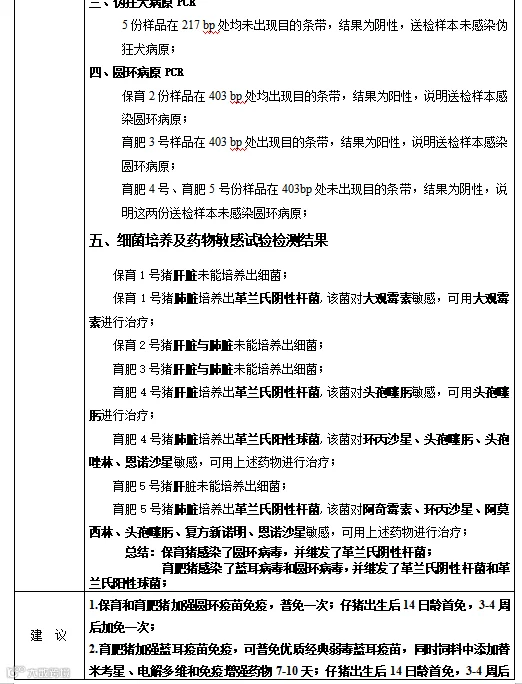 分析检测结果,可以看出由于没有做好基础免疫导致没有抗体保护,环境中有野毒存在,致使圆环、蓝耳混感继发感染细菌病。