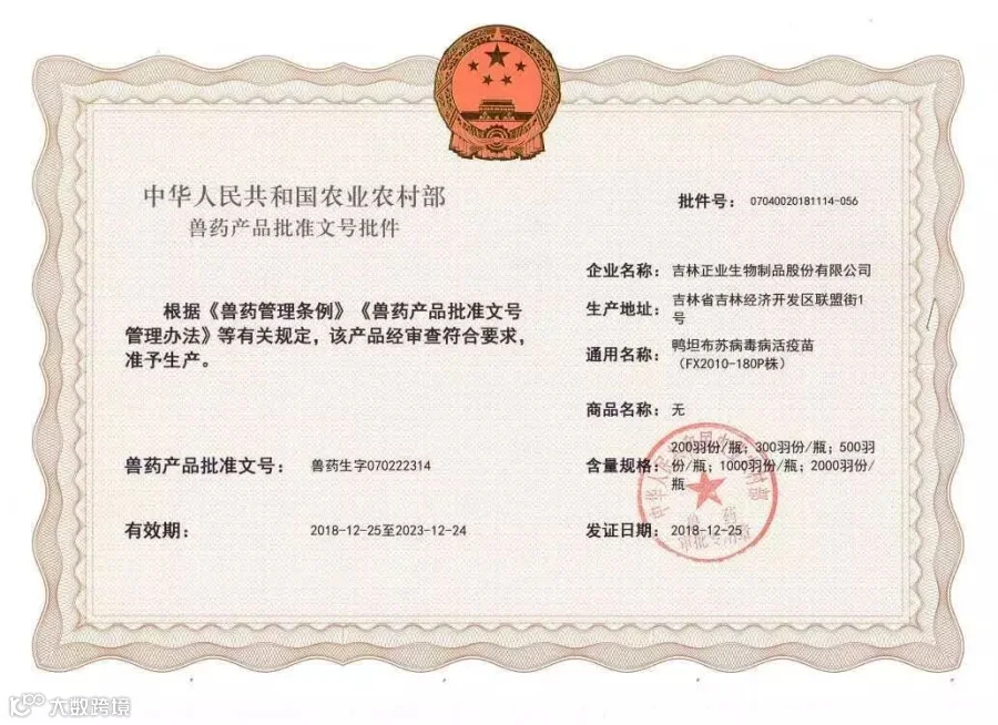 2018年10月正业生物又增加一款新品水禽疫苗—鸭坦布苏病毒活疫苗(FX2010-180P株),获得新兽药三类证书。正业生物将继续秉承“致力动保事业,护佑六畜兴旺”的企业宗旨,坚持“科技让动物更美好”的企业使命,继续在疫苗生产、研发与销售的路上开展产品的各项业务,我们期待您的关注。