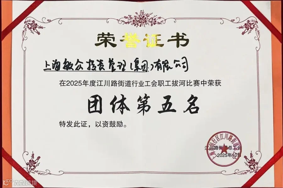 拔河绳上见精神,团结一心显担当。2025 年 10 月 22 日上午,备受瞩目的 2025 年度江川路街道行业工会职工拔河比赛暨物业管理行业工会第七届拔河比赛,在大零号湾体育活动中心(鹤庆路 788 号)二楼室外篮球场热血开赛。敏众集团积极响应,组建精锐队伍参赛,最终凭借顽强拼搏的精神斩获第五名的好成绩,在 20 支参赛队伍中崭露头角,书写了属于敏众人的热血篇章。