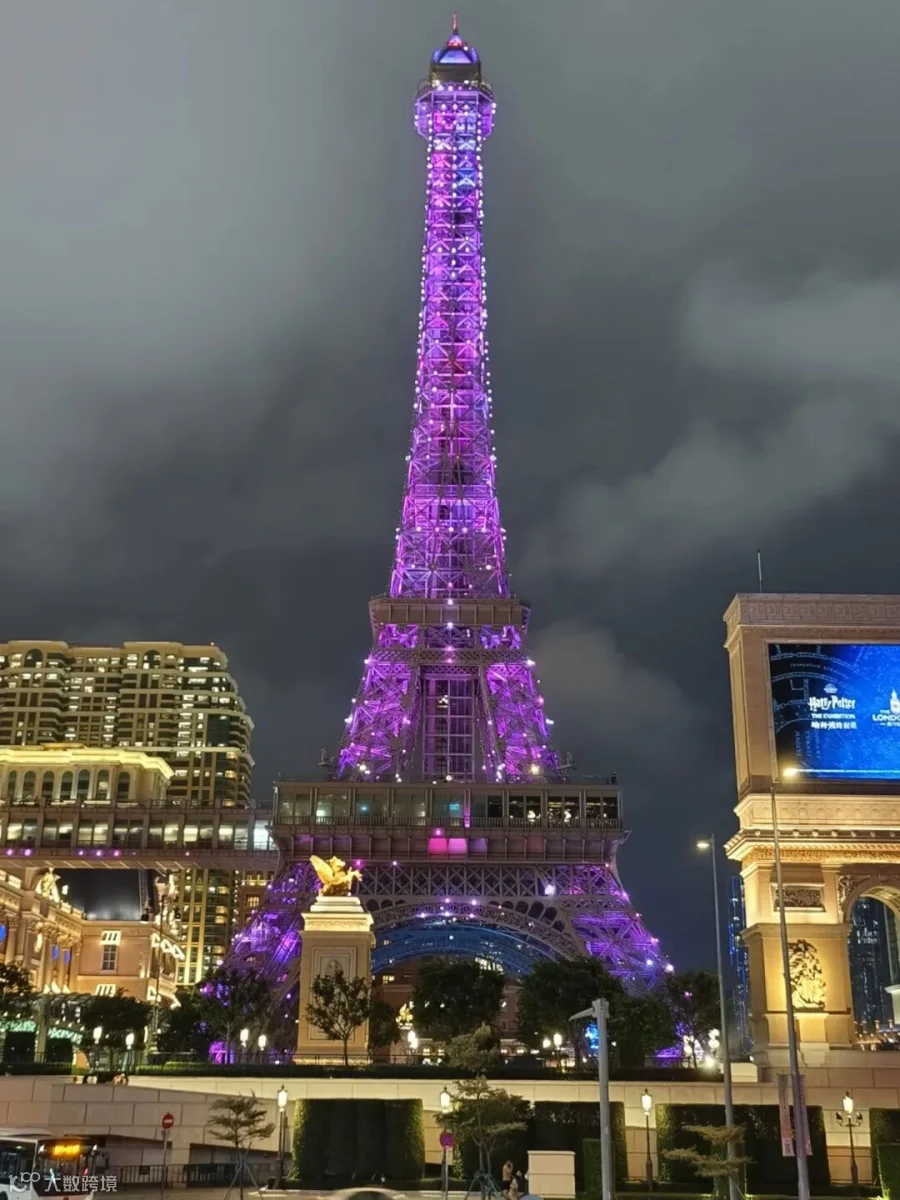 这张照片展现了一个引人注目的夜景,尤其是以紫色灯光装点的艾菲尔铁塔,给人耳目一新的感觉。