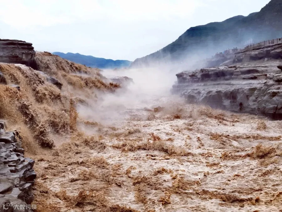 3. **色彩层次**:整体色调呈现出棕色和灰色的自然色彩,与背景的山脉形成了柔和对比。这种色彩选择不仅真实反映了自然景观,还突出了水流的浑浊与动感。