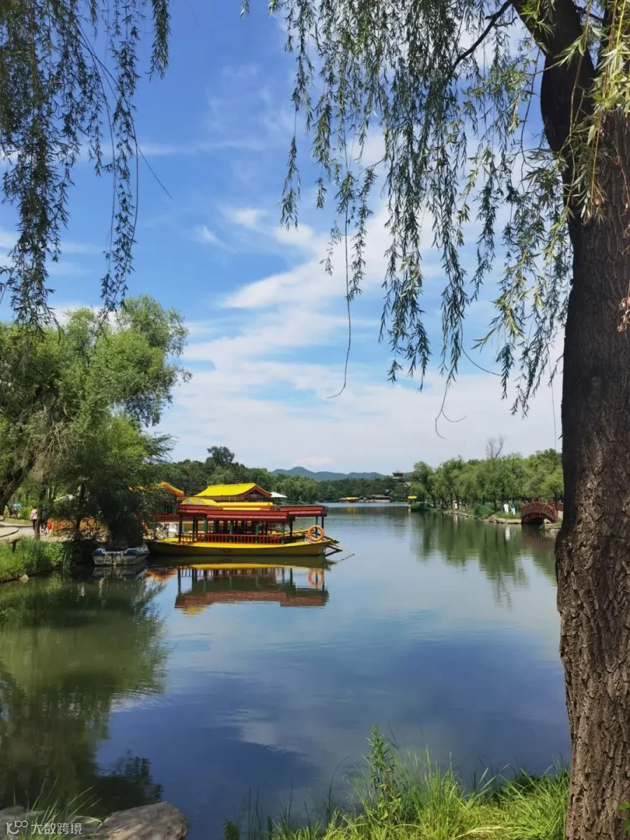 自然框架:前景的垂柳和树干形成了一个天然的框架,增加了画面的层次感,同时引导视线向湖面延伸。这样的框架手法让整个画面更具艺术感和立体感。