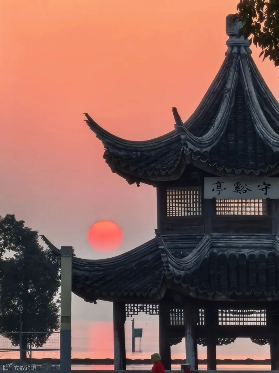 这张照片成功地将传统建筑与壮丽的夕阳结合,展现出一种独特的美感。
