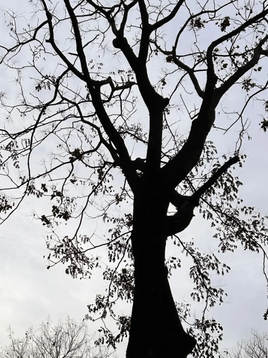 3. **光线与对比**:背景的淡灰色天空与树木的深色剪影形成了鲜明的对比,增强了视觉冲击力。这种对比使得树的形态更为突出,细节清晰可见。