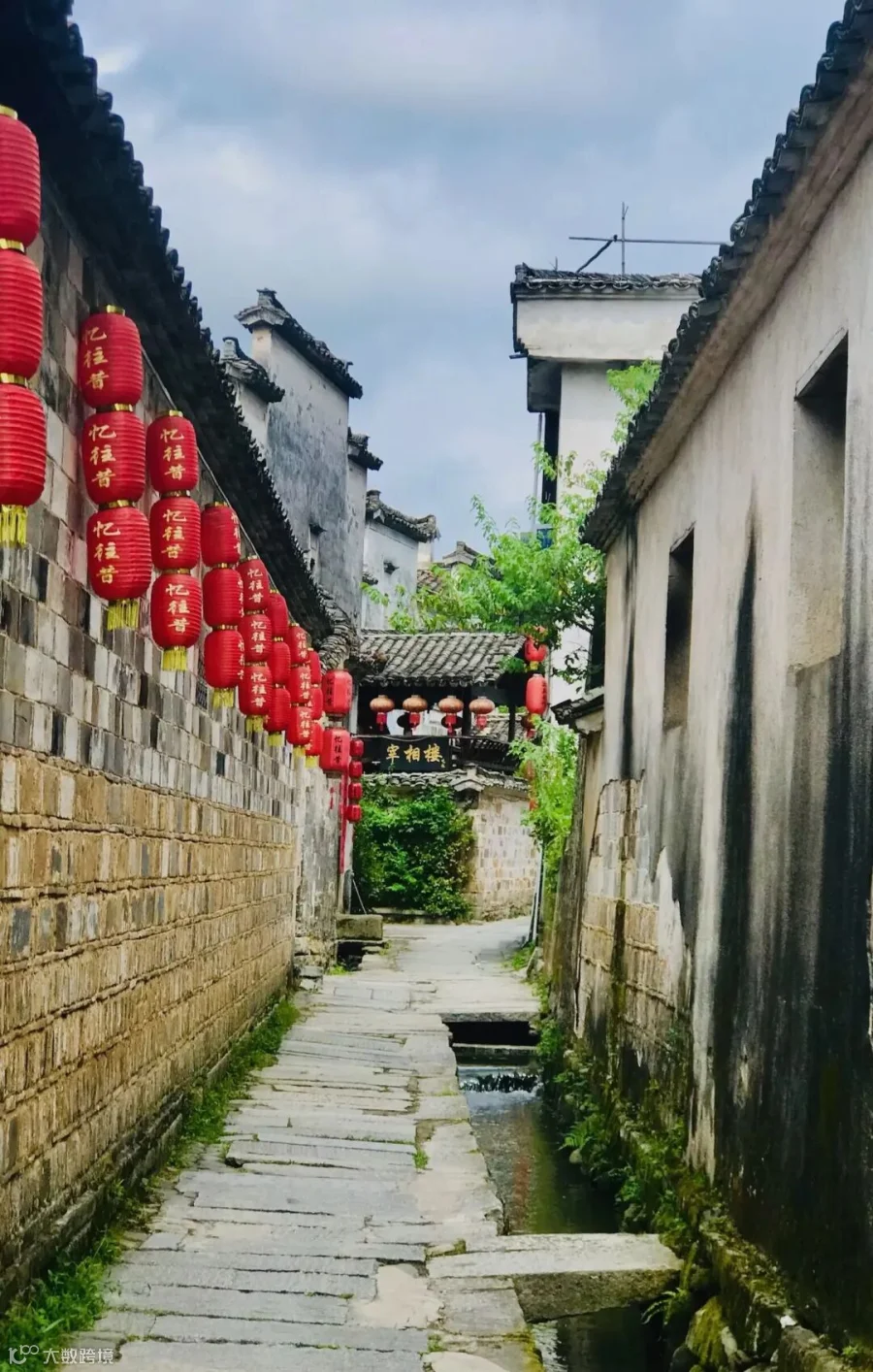 4. **细节呈现**:墙面和路面的质感很好地体现了时间的痕迹,给人一种历史的厚重感。同时,街道尽头的绿植与灯笼相呼应,平衡了整体构图中的色彩。