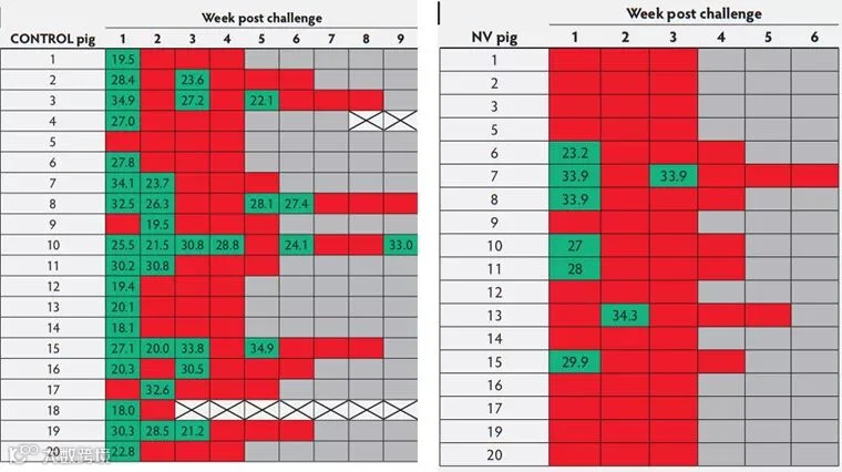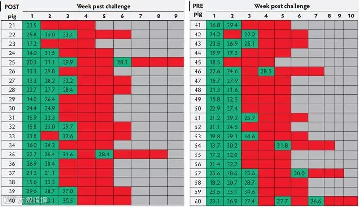 在这项研究中,无论在攻毒前还是攻毒后进行灭活苗的免疫都没有观察到对PEDV排毒持续时间的明显影响。之前感染过PEDV在第二次接触病毒后可缩短粪便中PEDV排毒的持续时间。然而,之前感染过病毒在再次感染病毒时并不能完全阻止粪便排毒。这可能是由于初次感染PEDV后,对同源病毒产生的保护作用。Gerber等人研究发现用同源的PEDV再次感染实验猪没有出现任何临床症状或病变,只有不到10%的实验猪出现排毒现象。这这项研究中,未免疫苗组出现了温和的临床症状,有38.9%的猪出现了排毒的现象。这项研究观察到攻毒后粪便排毒的持续时间超过9周。Bjustrom-Kraf J等人的研究表明攻毒后病毒排毒的持续时间为10周。从试验结果看,无论是在攻毒前或攻毒后,后备母猪进行灭活苗的免疫不能缩短病毒在粪便中排毒的时间。因此,病毒的排毒不受灭活苗的影响。之前感染过有致病性的PEDV,在再次感染PEDV后对病毒的排毒时间有显著影响。