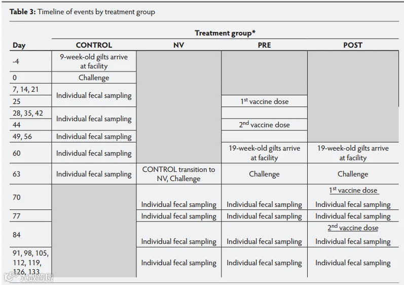 2013年美国暴发了严重的以腹泻和呕吐为主要症状的PEDV疫情,死亡率接近100%。种猪场通过在生物安全允许下有意使猪群接触病毒,使猪场恢复了正常,并产生了免疫力。对于曾经感染过PEDV的猪场,一些养殖者选择在后备母猪被引入母猪群之前进行驯化。如果后备母猪在驯化后太早进入猪群,则后备母猪易成为传染源使猪场母猪和仔猪再次感PEDV。驯化后备母猪并使其在排毒期之后引入母猪群是防控母猪群感染PEDV的的一种成功策略。研究表明感染PEDV后,粪便和口腔液排毒维持时间为69天(Bjustrom-Kraf J 等,2016)。因此,后备母猪在驯化后至少需要隔离饲养10周方可引入母猪群。由于返饲成本高时间长,为了了解使用疫苗后是否会对PEDV排毒时间产生影响,研究人员设计了以下试验以作评估。