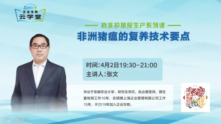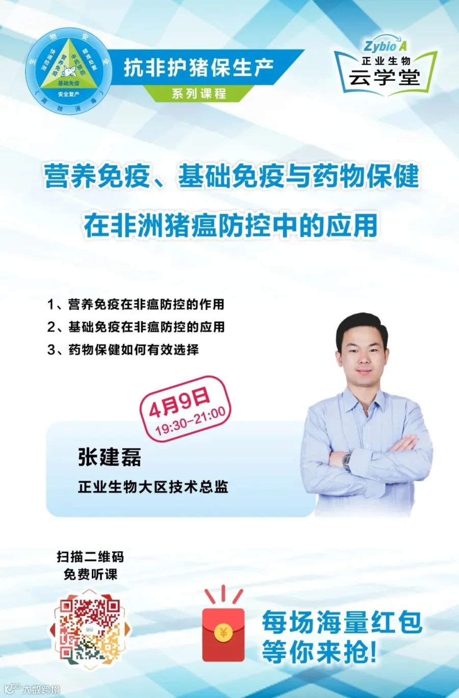 4月2日正业生物云学堂进行了“抗非四式 护猪三招”第五课,由正业生物大区技术总监张文从多方面多角度对《非洲猪瘟的复养技术要点》做了详实的讲解及实操方法。