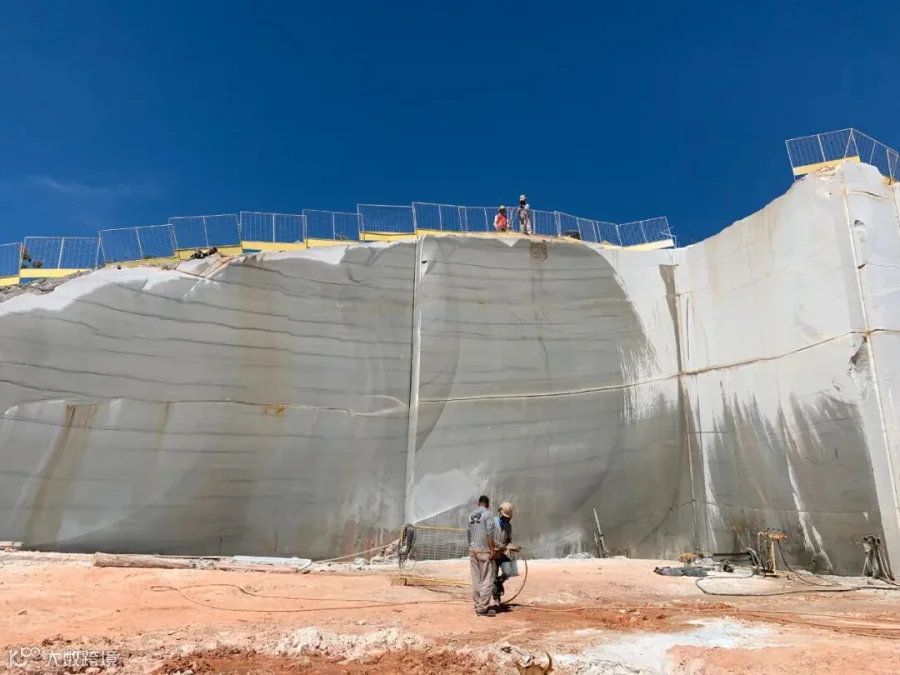 在选材时,我们利用矿山优势,同一立面尽可能选用同一矿层荒料,让颜色过渡自然。