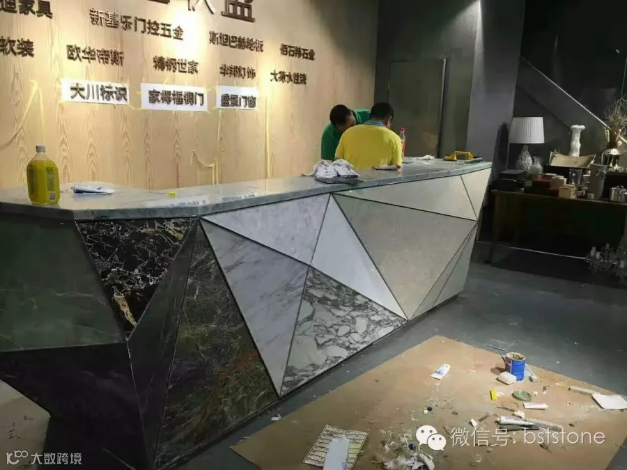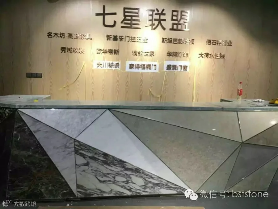 衣服混搭可以在时尚界混出一片天地,而石材的混搭不能瞎搭,否则一切就是白搭。由深圳多家知名企业强势联盟组成的七星联盟,坐落在深圳市南山区蛇口支5路。目前展厅正在全面装修中,一走进去首先吸引眼球的就是由不同的石材搭成的具有3D效果多维几何的前台,每一块石材在不同的灯光照射下,在视觉上给你带来强烈的冲击感,体验不同的石材魅力。此次石材是由佰石特石业有限公司专门提供并制造,加盟七星联盟是佰石特向更广阔的道路迈进的一大步。