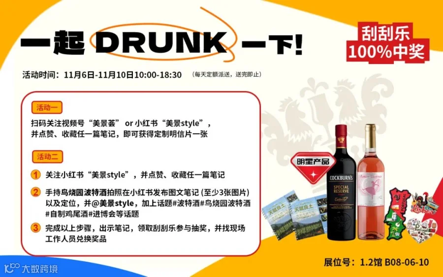 关注官方微信公众号/小红书账号,拍摄优质展台照片/视频,在小红书带话题发布图文笔记并@美景style,可获得定制明信片以及刮刮卡一张,更有机会获得“明星产品”—鸟烧园宝石珍藏波特酒750ml一瓶~