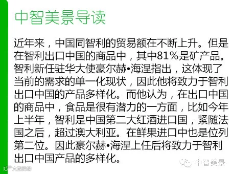 豪尔赫大使说,智利是南美洲国家中距离中国最远的一个,但是两国关系却非常紧密,“对于智利来说,中国是最大的贸易伙伴;对于中国,智利也是其在南美洲第三大贸易伙伴。去年智中双边贸易额达到330亿美元,这个数字令人振奋。”