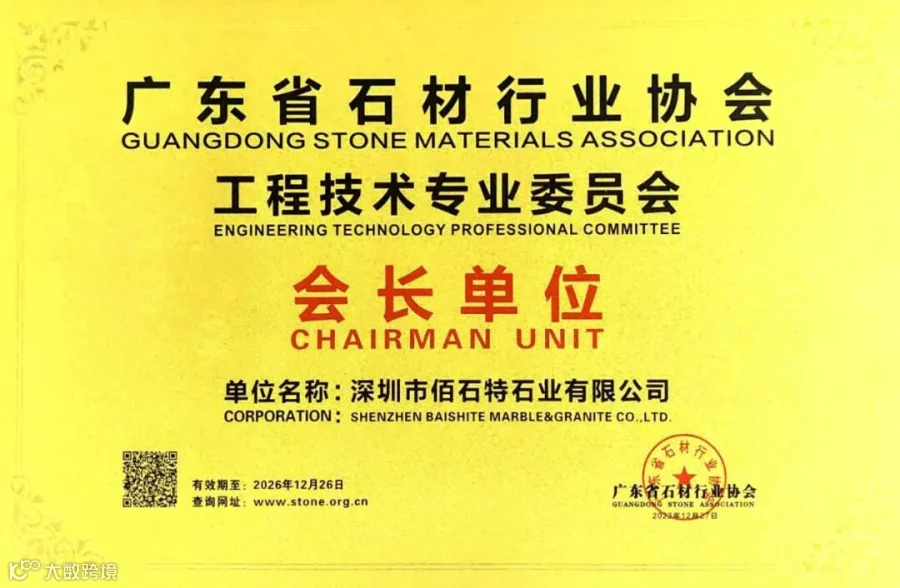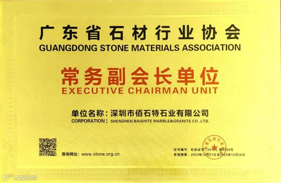 广东省石材行业协会授予深圳市佰石特石业有限公司为常务副会长单位及工程技术专业委员会会长单位等荣誉证书。