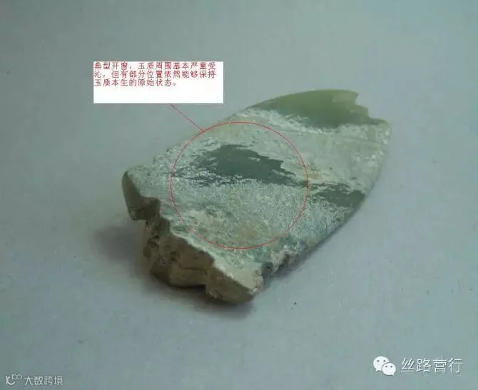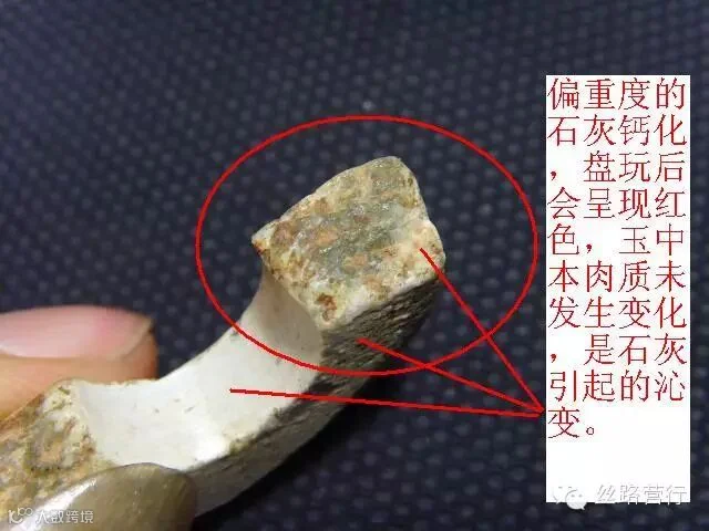 这是玉石一种变质现象,多由氧化和复分解过程而形成比较疏松的物质,所以较为松脆,怕磕碰。这种钙化层就越厚。